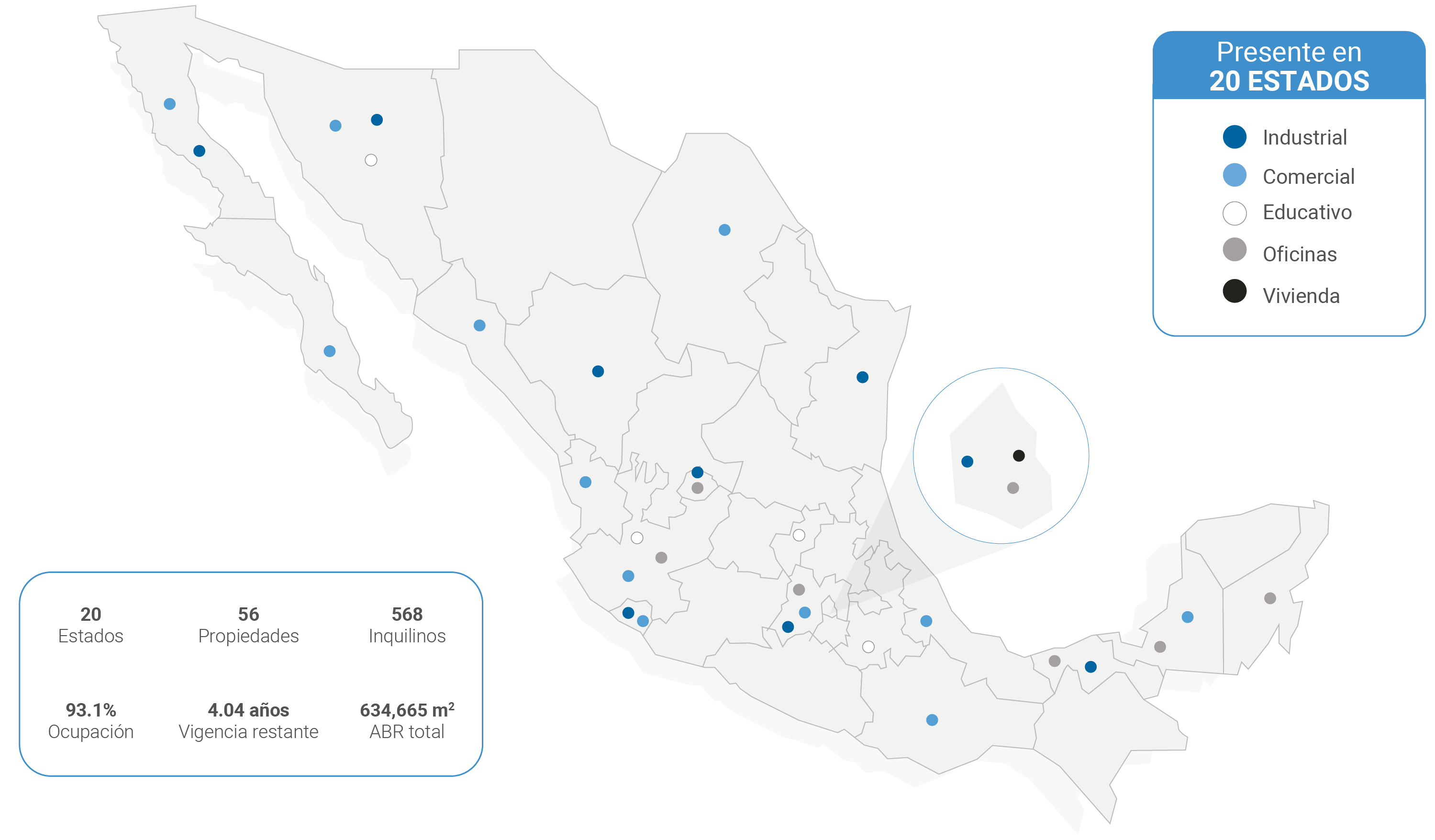 En términos de distribución geográfica, al cierre de 2025, el ABR del portafolio del Fideicomiso se encontraba distribuido en 20 entidades federativas de México, principalmente en la CDMX, el Estado de México y Sonora, donde se concentra el 18%, 14% y 13% del ABR total, respectivamente.